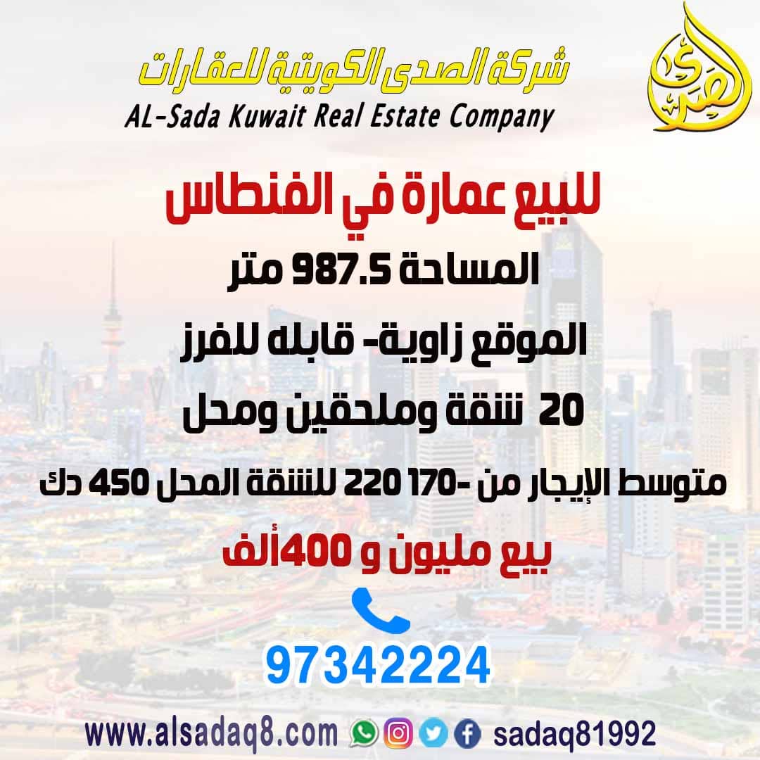 للبيع عمارة في الفنطاس زاوية 987.5 متر