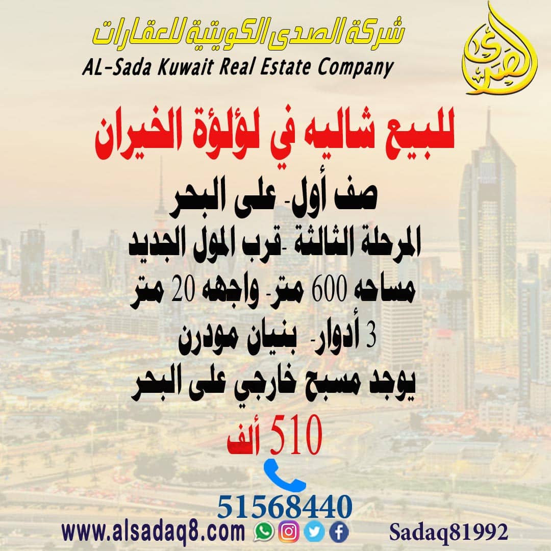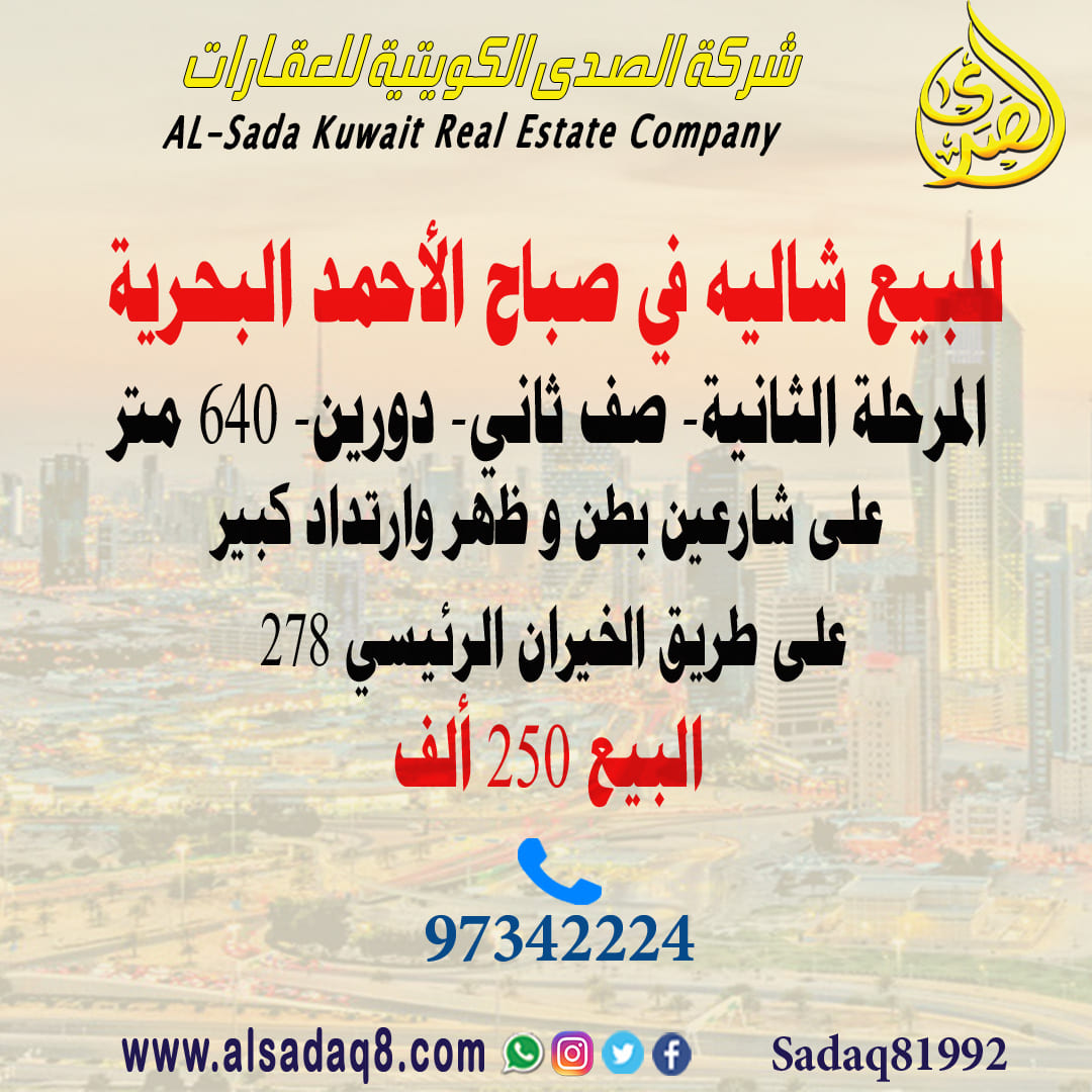 للبيع شاليه في صباح الأحمد البحرية على البحر مباشرة 1237متر
