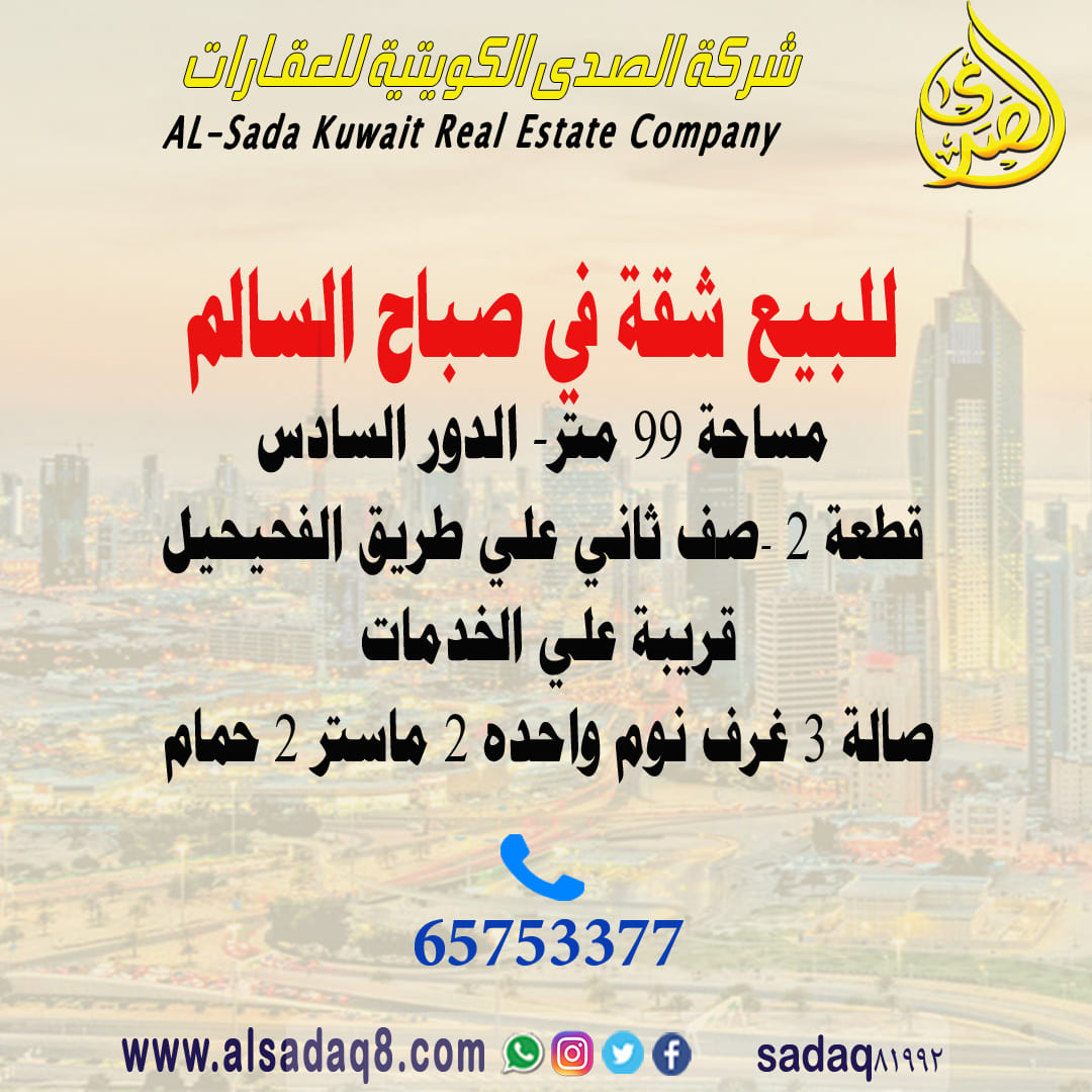 مساحة 99 متر- الدور السادس قطعة2-صف ثاني علي طريق الفحيحيل